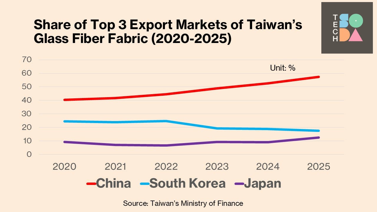 In the first eleven months of 2025, Taiwan’s exports of high-end glass fiber fabric surged to a record US$350 million—a 39.9% year-on-year increase, while nearly 60% was shipped to China. While these shipments are perfectly legal, they serve as a high-fidelity “thermometer” for China’s AI ambitions. As high-performance glass fiber fabric is the essential structural backbone for AI servers and IC substrates, this surge confirms that China is not just making chips, but successfully integrating them into large-scale AI infrastructure.